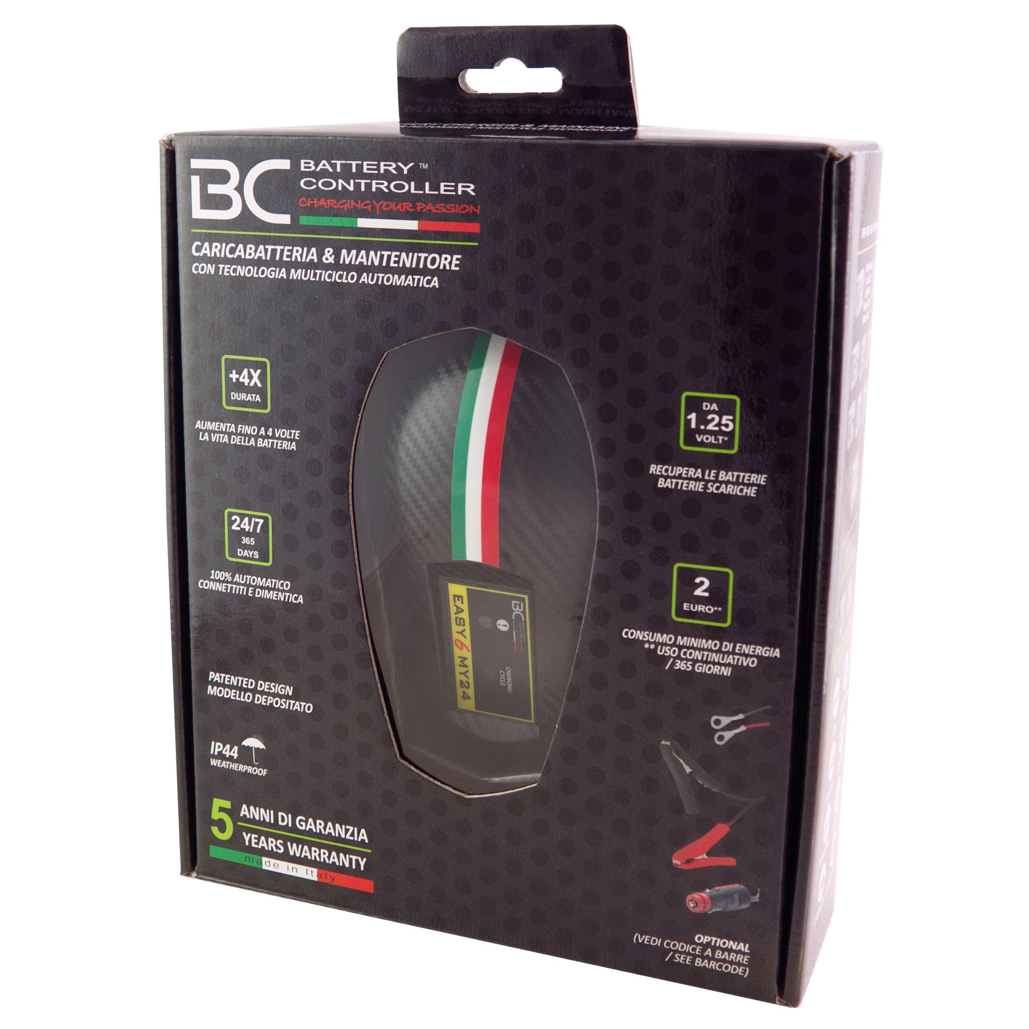 Tous les chargeurs/mainteneurs de batterie de la gamme BC Battery Controller sont entièrement produits en Italie et donc 100% Made in Italy, de dernière génération et parmi les plus sûrs et les plus avancés du marché. Ils effectuent 8 cycles de charge de manière entièrement automatique, conçus pour une récupération, une charge, une désulfatation parfaite ainsi que pour l'entretien à très long terme des batteries de démarrage présentes dans les voitures, motos, scooters, camping-cars, tracteurs et véhicules de jardinage. La technologie de charge et de maintenance BC est également idéale pour les batteries stationnaires « d'alarme domestique ». En effet, elles peuvent rester connectées 365 jours par an et impliquent dans ce cas une consommation maximale de 2 euros d'électricité en cas d'utilisation continue.